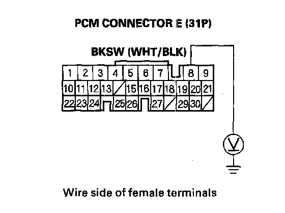 18. Measure the voltage between PCM connector terminal E8 and body ground while pressing the brake pedal and when the brake pedal is released.