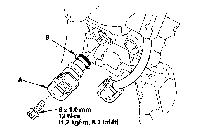 2. Install the new O-ring (B) on the new input shaft (mainshaft) speed sensor, then install the input shaft (mainshaft) speed sensor in the transmission housing.
