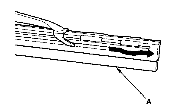 2. Press and hold the tab (A) and slide the wiper blade (B) toward the tab until it releases from the wiper arm (C).