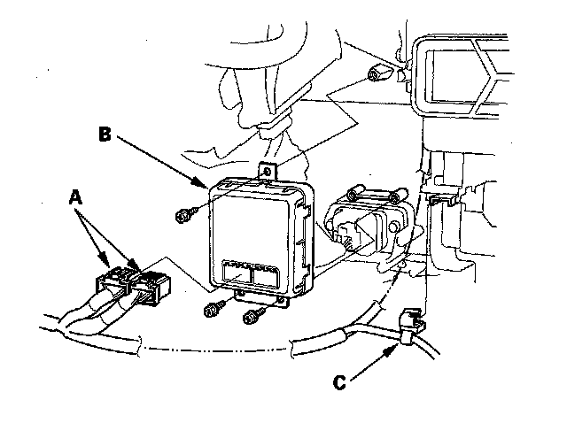 4. Disconnect the connectors (A) from the climate control unit (B), then remove the wire harness clip (C), the self-tapping screws and the climate control unit.