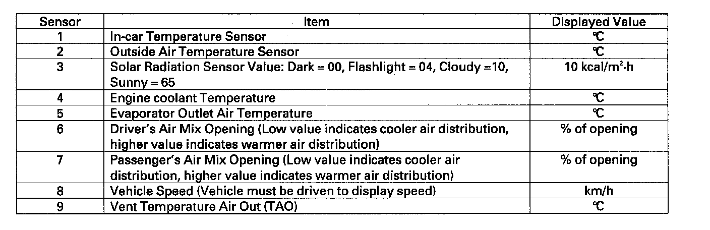 Displaying Sensor Inputs at the Climate Control UnitThe climate control unit has a mode that displays sensor inputs it receives. This mode shows you what the climate control unit is receiving from each of the sensors, one at a time, and it can help you determine if a sensor is faulty.