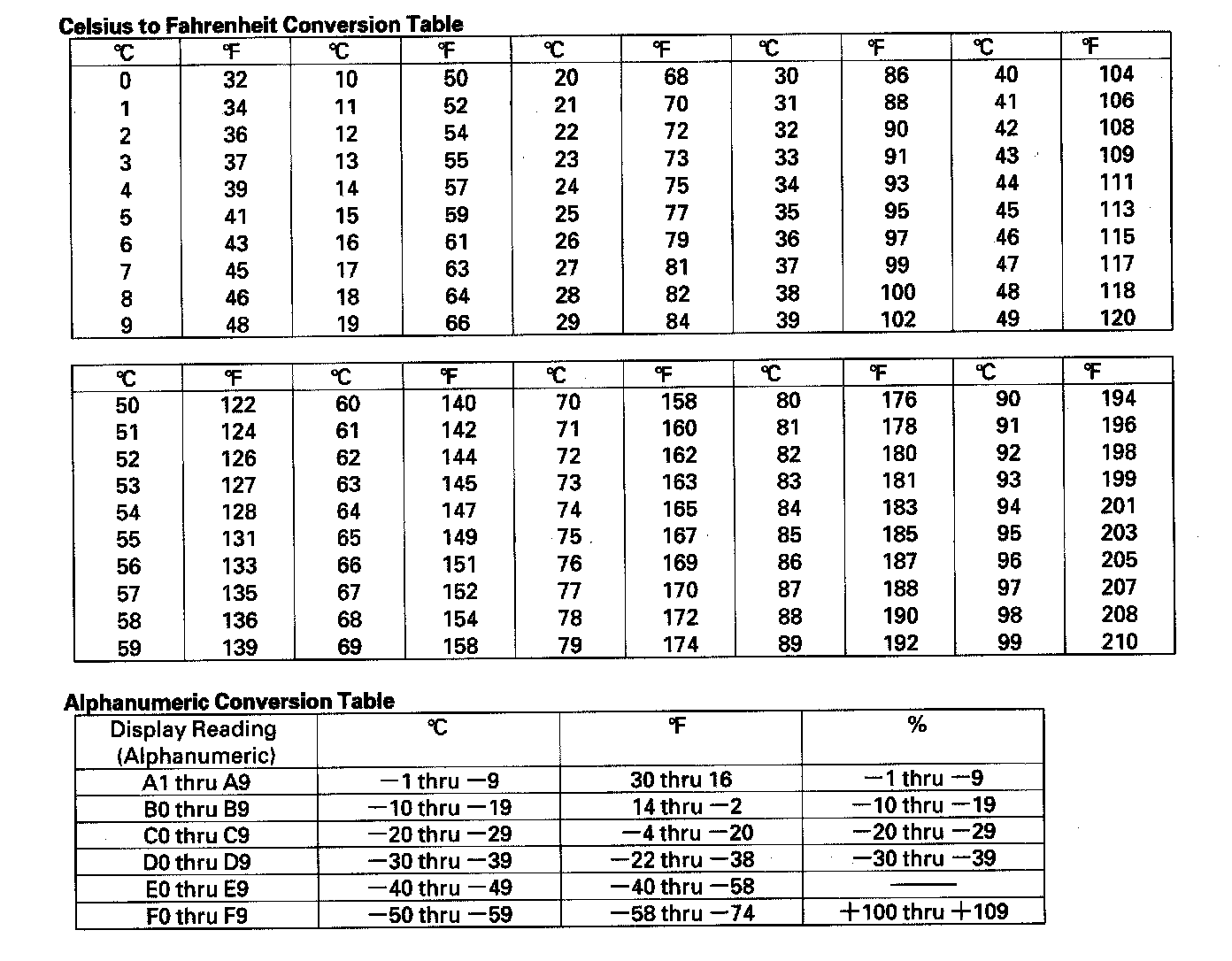 - The sensor values will be displayed in degrees Celsius (degree °C) or an alphanumeric code. Use the chart to convert the value to degrees Fahrenheit (degree °F).