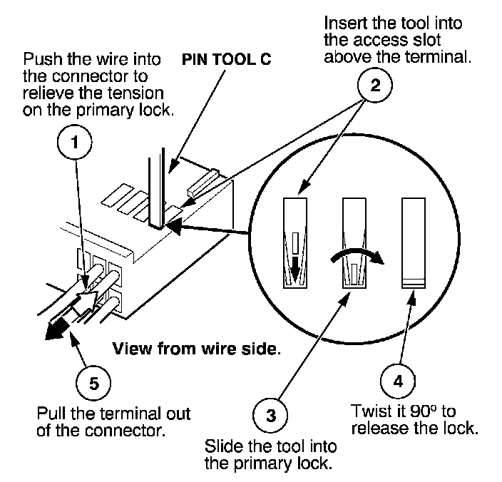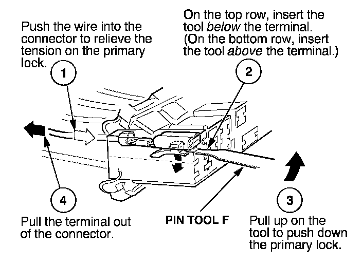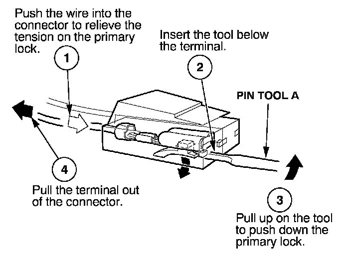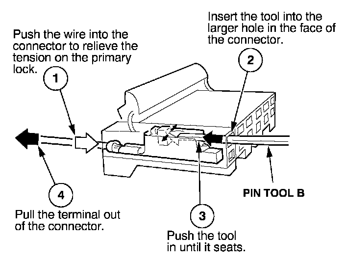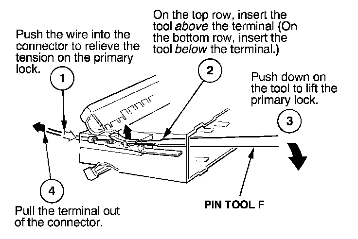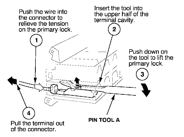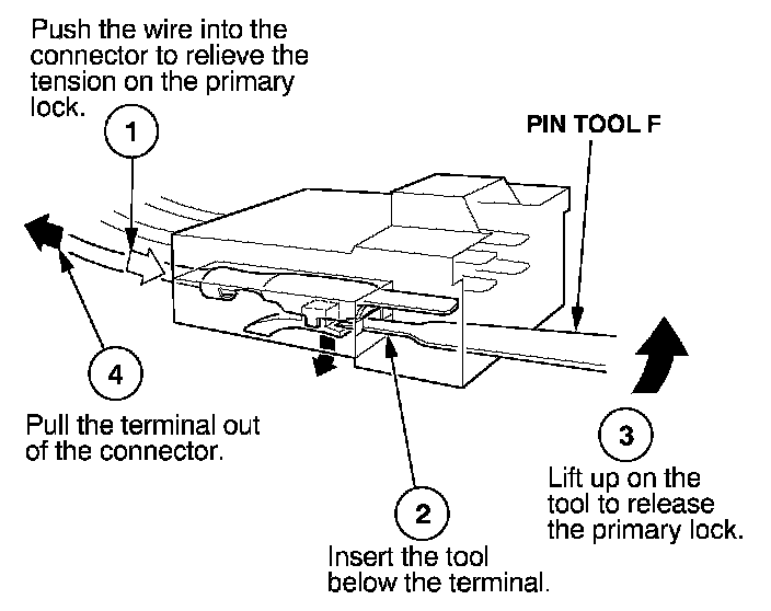 Before you begin, inspect the wire you are about to repair for damage and length. Make sure the wire will be long enough to make a terminal repair without stretching it when you reinstall the terminal in the connector. If the wire is too short, or if access to the connector is too restricted to make a terminal repair, you may need to install a pigtail terminal (a short length of wire with a factory-crimped terminal on it). Refer to HOW TO INSTALL PIGTAIL TERMINALS.