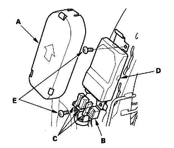 1. Place the new ODS unit (A) on the seat-back frame. Tighten the two bolts (B), and connect the ODS unit harness 18P connector (C) and sensor connectors (D) to the ODS unit. Reinstall the cover (E).