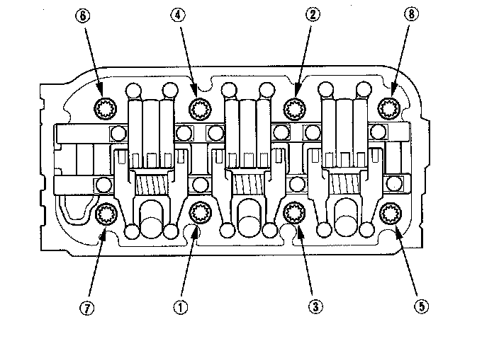 Tighten the bearing cap bolts, and then the bearing cap side bolts to the specified torque in the sequence as shown. Repeat the torque sequence again to make sure the bolts are properly torqued.