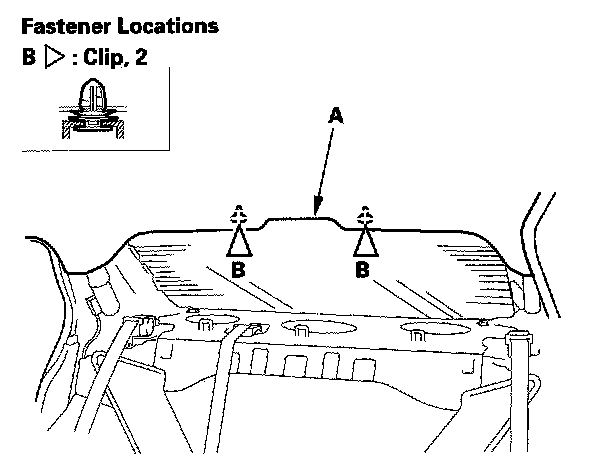 4. Pull down the rear portion of the headliner (A) by detaching the clips (B). Take care not to bend the headliner excessively, or you may crease or break it.