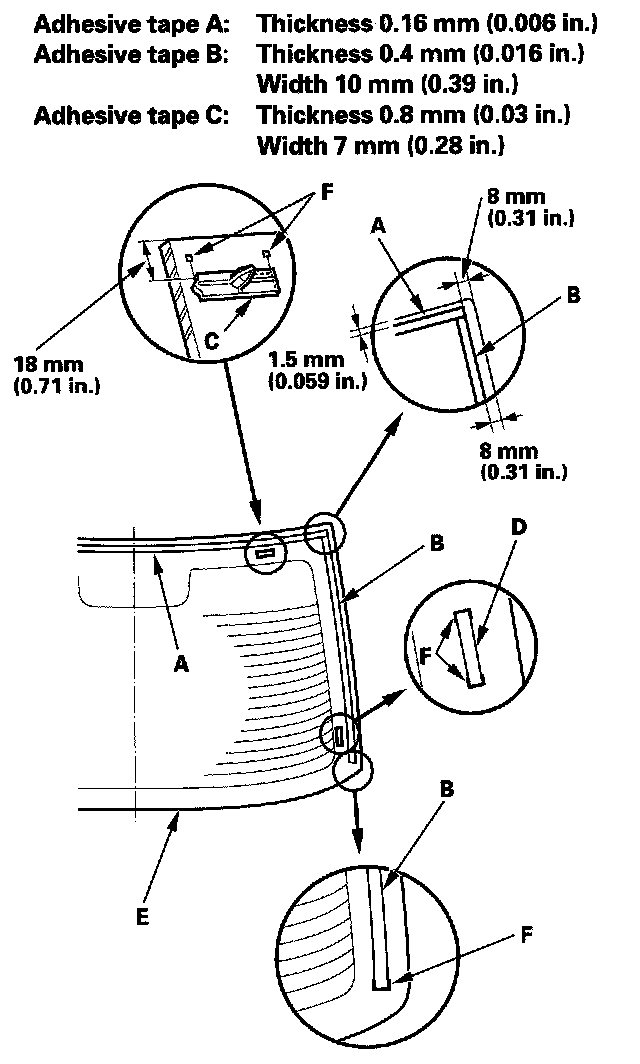 12. Attach the upper rubber dam (A), side rubber dams (B) with adhesive tape A, clips (C) with adhesive tape B, and fasteners (D) with adhesive tape C to the inside face of the rear window (E) as shown: