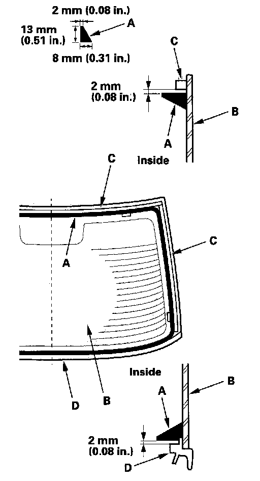 20. Put the cartridge in a caulking gun, and run a bead of adhesive (A) around the edge of the rear window (B) between the dams (C) and molding (D) as shown.Apply the adhesive within 30 minutes after applying the glass primer. Make a slightly thicker bead at each corner.