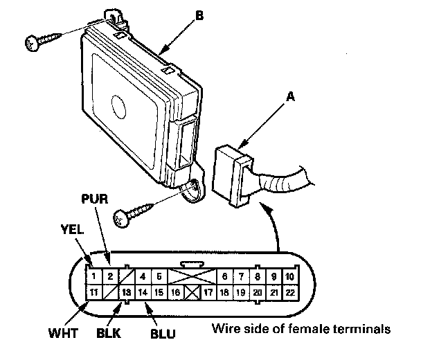 3. Disconnect the 22P connector (A) from the HandsFreeLink control unit (B).