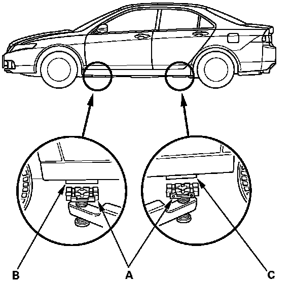 1. Position the hoist lift blocks (A), or safety stands, under the vehicle's front support points (B) and rear support points (C).