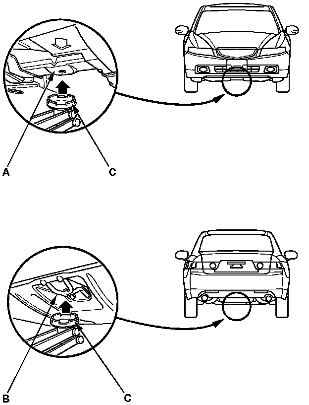 3. Position the floor jack under the front jacking bracket (A) or rear jacking bracket (B), center the jacking bracket in the jack lift platform(C), and jack up the vehicle high enough to fit the safety stands under it.