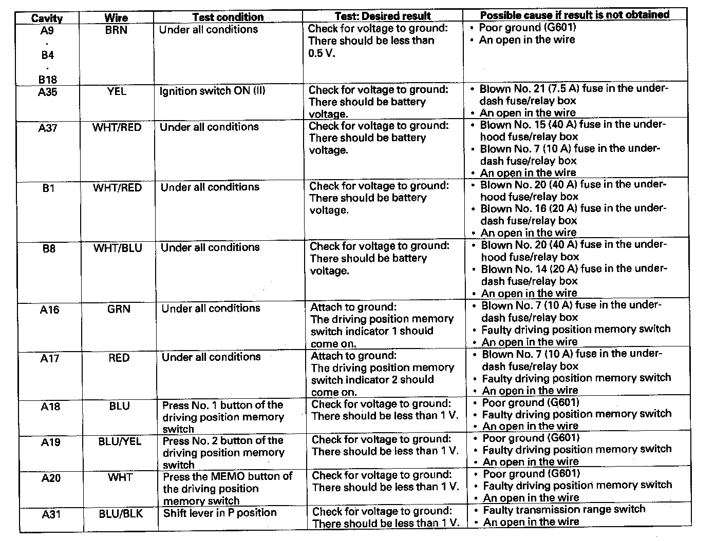 5. Reconnect the connectors to the power seat control unit, and make these input tests at the connectors.