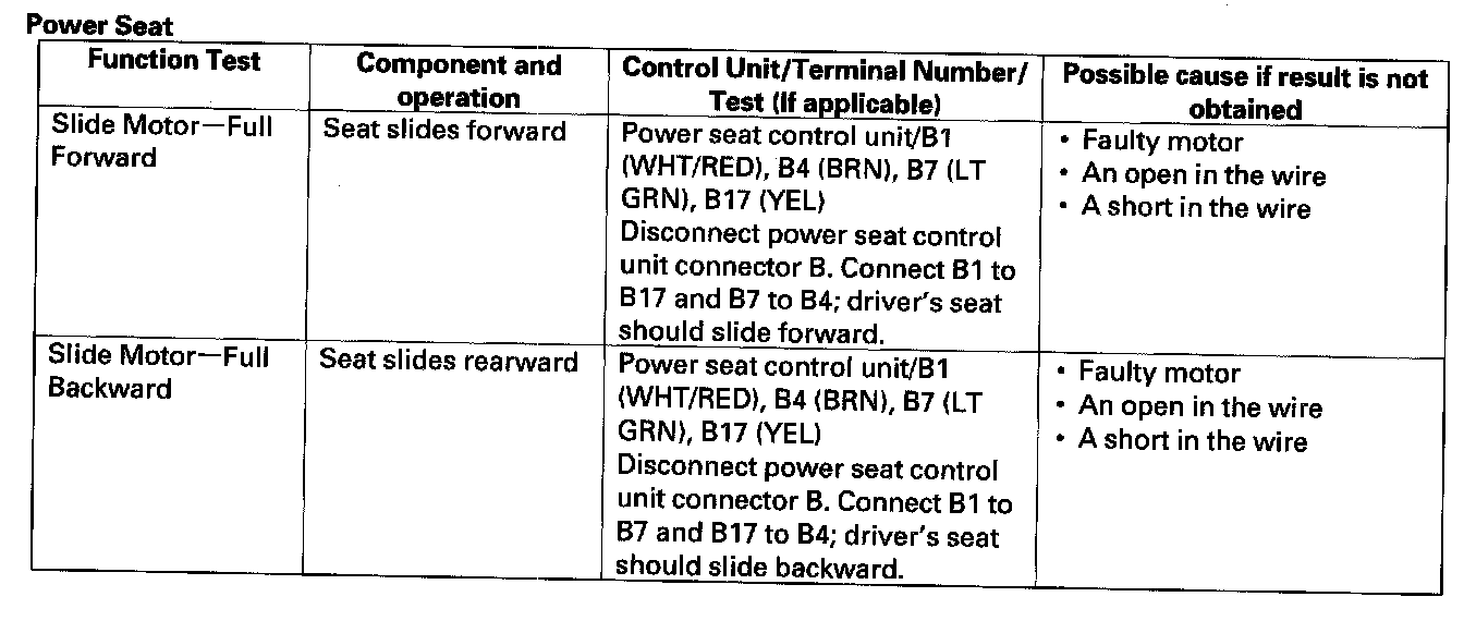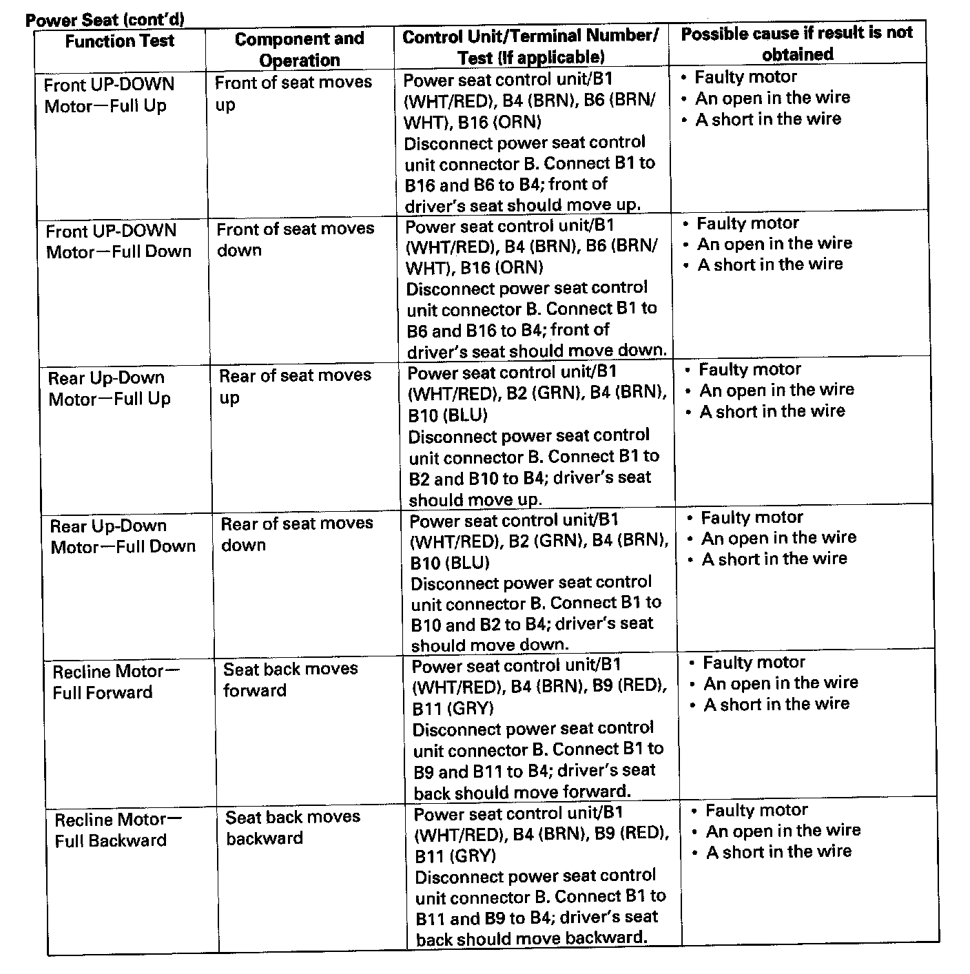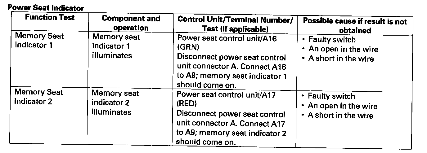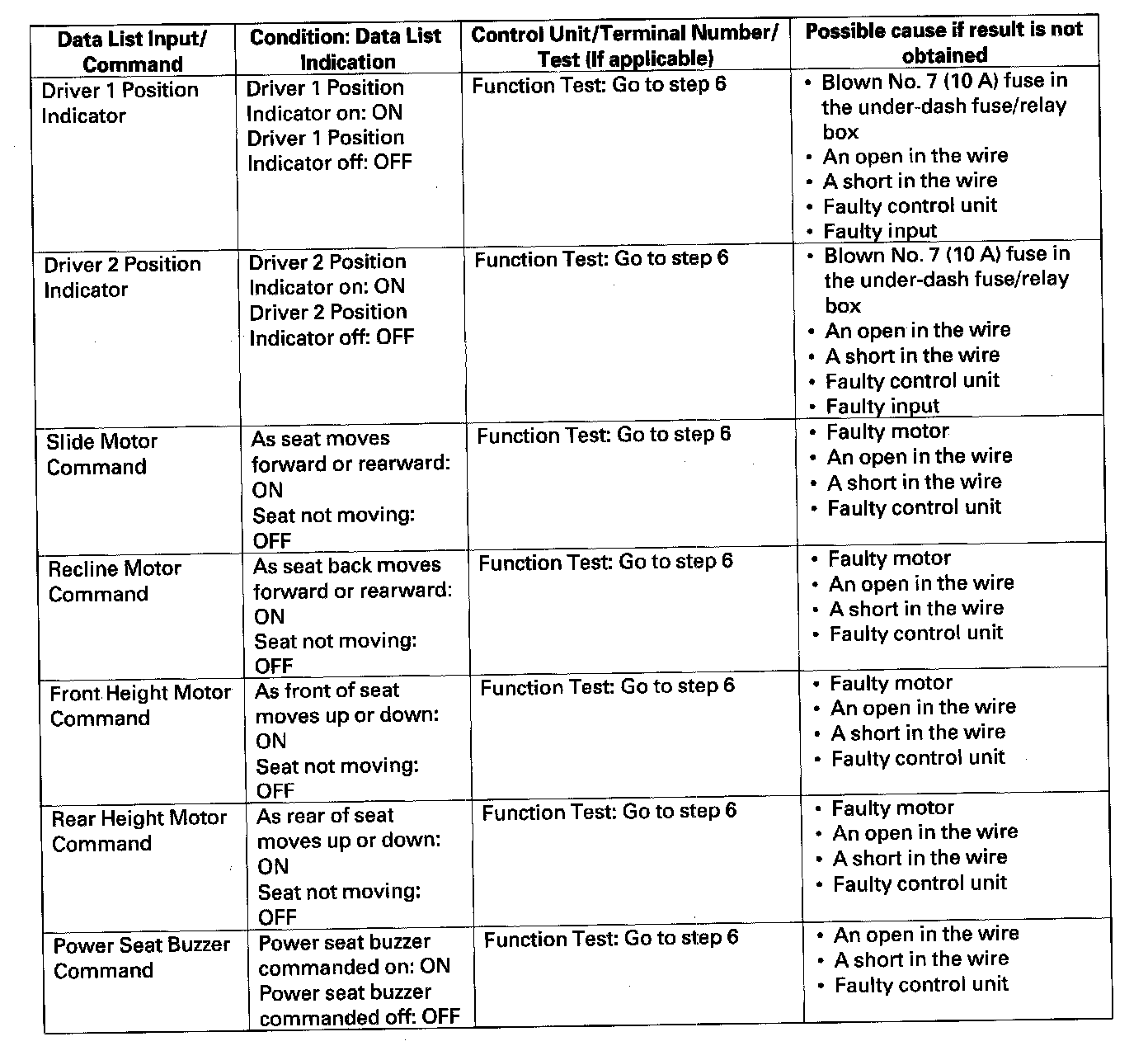 - If the function does not operate normally, perform the appropriate test at the control unit and terminal indicated in the table.