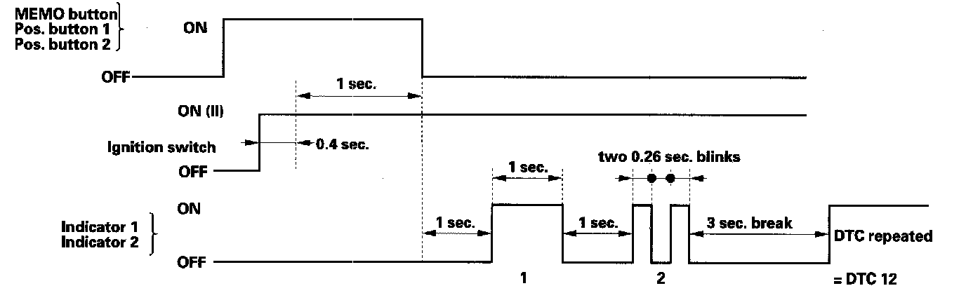 If a system problem occurs, and a DTC is stored, the indicators will show the DTC. The first digit is indicated by the number of long (1 second) blinks, and the second digit is indicated by the number of short (0.26 second) blinks. There is a 3 second break between each DTC when there are multiple DTCs.