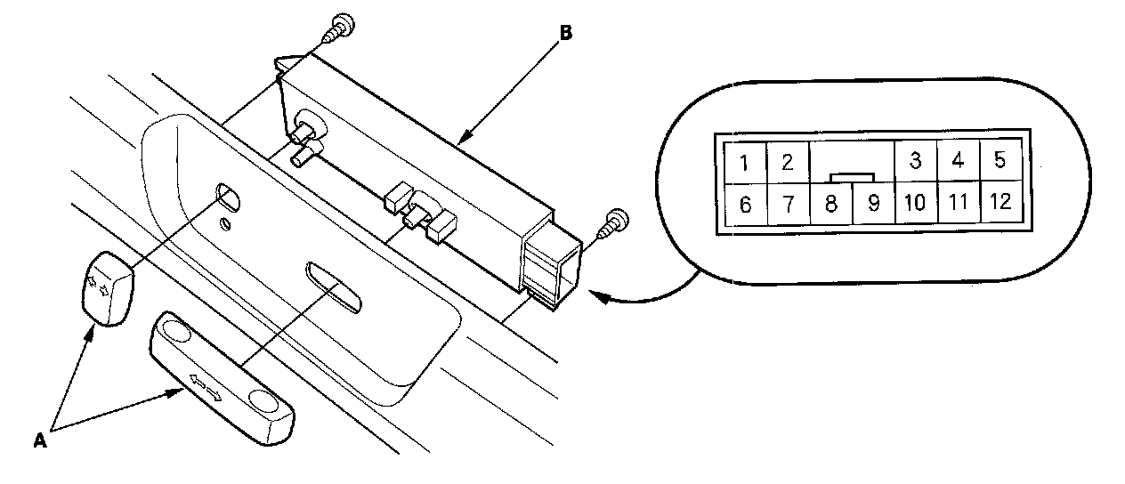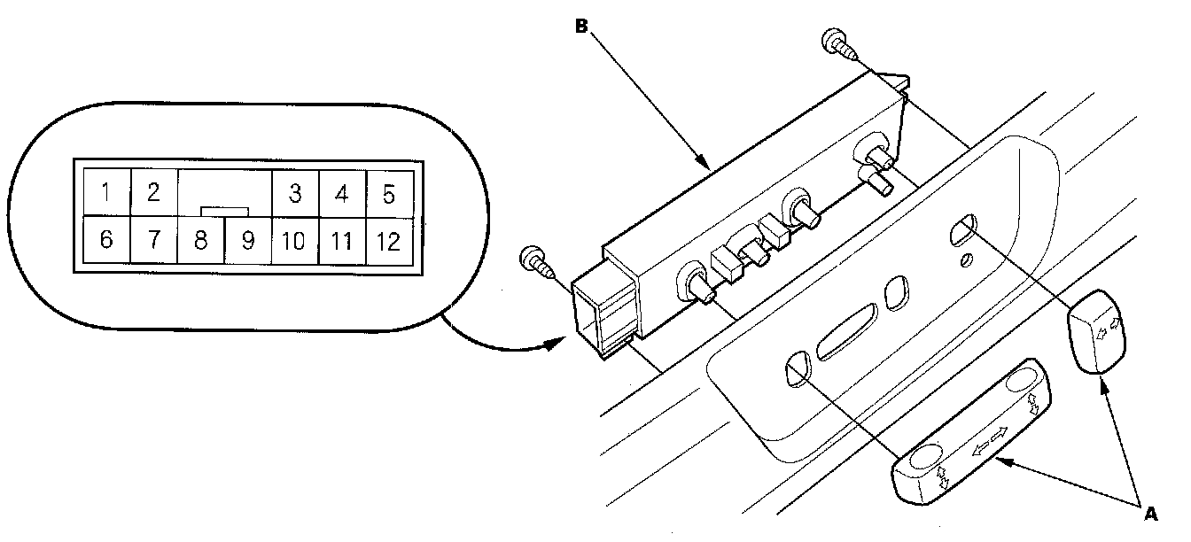 1. Remove the power seat adjustment switch knobs (A) and recline cover from the driver's power seat, then remove the two screws and the power seat adjustment switch.