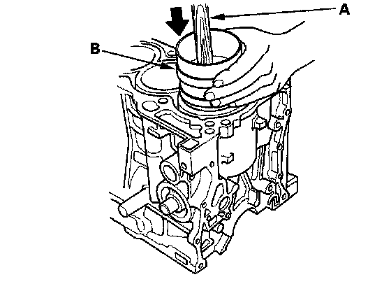 3. Position the piston in the cylinder, and tap it in using the wooden handle of a hammer (A). Maintain downward force on the ring compressor (B) to prevent the rings from expanding before entering the cylinder bore.