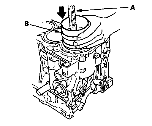 4. Position the piston in the cylinder, and tap it in using the wooden handle of a hammer (A). Maintain downward force on the ring compressor (B) to prevent the rings from expanding before entering the cylinder bore.
