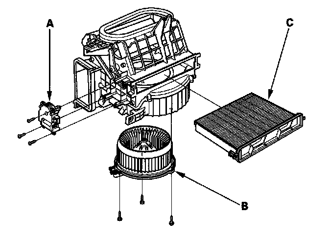 - The recirculation control motor (A), the blower motor (B), and the dust and pollen filter (C) can be replaced without removing the blower unit.
