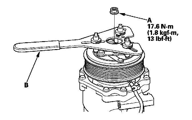 1. Remove the center nut (A) while holding the armature plate with the special tool (B).