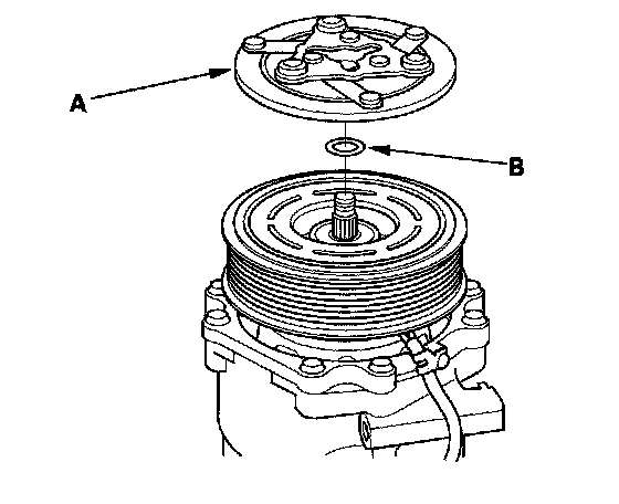 2. Remove the armature plate (A) and shim(s) (B), taking care not to lose the shim(s). If the clutch needs adjustment, increase or decrease the number and thickness of shims as necessary, then reinstall the armature plate, and recheck its clearance.