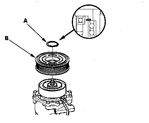 3. If you are replacing the field coil, remove the snap ring (A) with snap ring pliers, then remove the rotor pulley (B). Be careful not to damage the rotor pulley and A/C compressor.