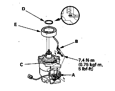 4. Remove the bolt and holder (A), then disconnect the field coil connector (B). Loosen the clamp screw (C) to free the field coil wire. Remove the snap ring (D) with snap ring pliers, then remove the field coil (E). Be careful not to damage the field coil and A/C compressor.