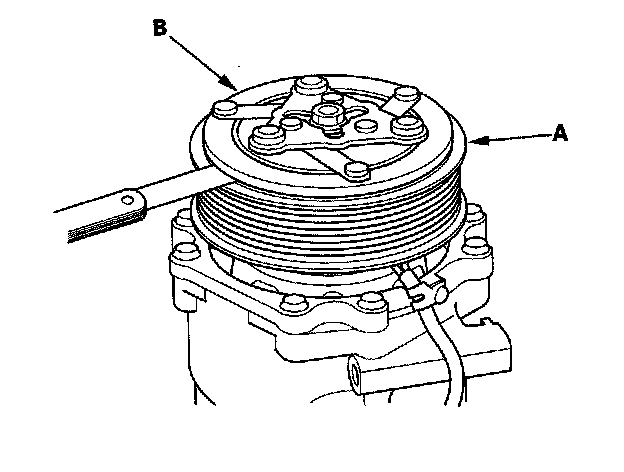 3. Measure the clearance between the rotor pulley (A) and the armature plate (B) all the way around. If the clearance is not within specified limits, remove the armature plate and add or remove shims as needed to increase or decrease clearance.