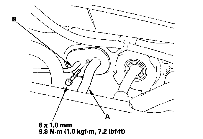 2. Remove the bolt, then disconnect the suction line (A) and the receiver line (B) from the evaporator core.