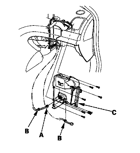 4. Disconnect the connector (A) from the power transistor, then remove the wire harness clips (B) the self-tapping screws, and the expansion valve cover (C).