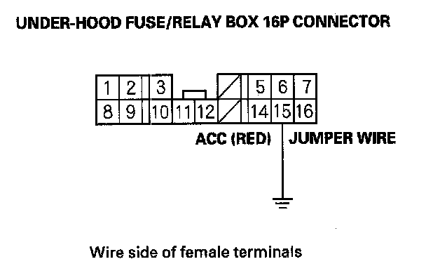 9. Momentarily connect under-hood fuse/relay box 16P connector terminal No. 15 to body ground with a jumper wire several times.