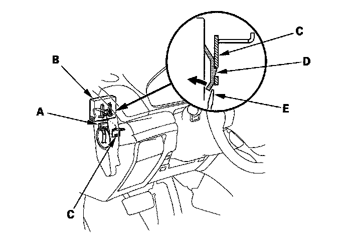 NOTE: While separating the TPMS control unit from the bracket, release the hook (D) on the TPMS control unit using a flat-tipped screwdriver (E), and push up to release it from the bracket.