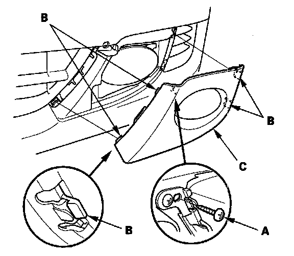 2. Remove the screw (A), and release all of the hooks (B) then remove the front fog light cover (C).