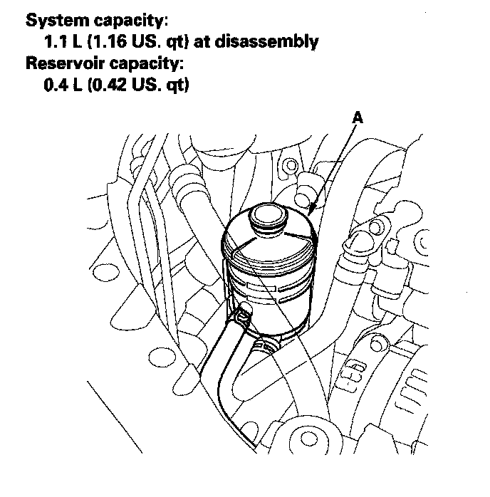 Fluid ReplacementCheck the reservoir (A) at regular intervals, and add the recommended fluid as necessary. Always use Acura Power Steering Fluid. Use of any other type of power steering fluid or automatic transmission fluid can cause increased wear and poor steering in cold weather.