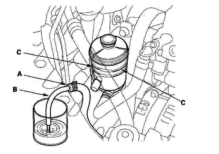 3. Start the engine, let it run at idle, and turn the steering wheel from lock-to-lock several times. When fluid stops running out of the hose, shut off the engine. Discard the fluid.