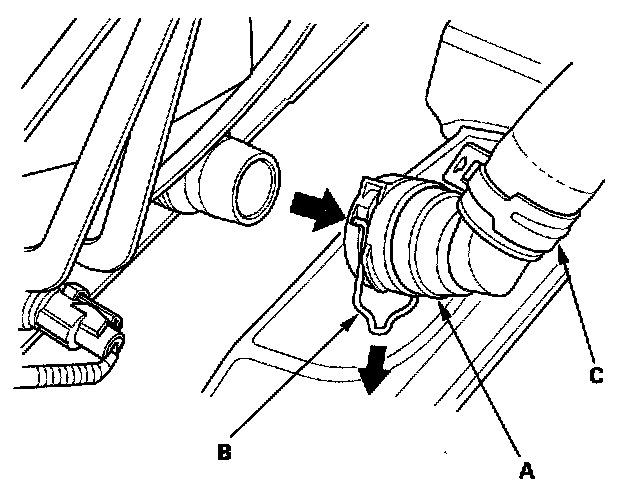 4. Remove the clamp (C) from both ends of the lower radiator hose and remove them from the thermostat and quick connector.