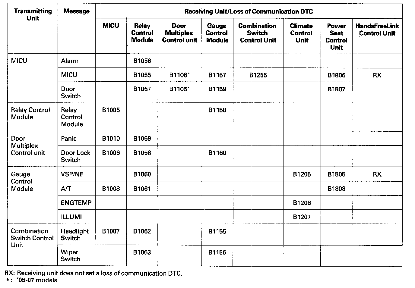 When an ECU is unable to communicate with the other ECUs on the circuit, the other units will set loss of communication DTCs. Use this chart to find the control unit that is not communicating.