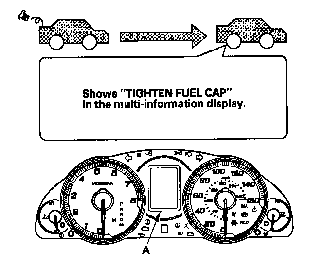 The first time a leak is detected a "TIGHTEN FUEL CAP" message in the multi-information display (A). To scroll to another message, press the select/reset button. The "TIGHTEN FUEL CAP" message will appear each time you restart the engine until the system turns the message off. Turn the engine off then replace or tighten the fuel fill cap until it clicks at least once. The message should go off after several days of normal driving after the fuel fill cap has been tightened or replaced.