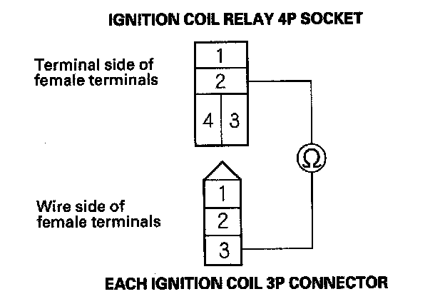 4. Check for continuity between ignition coil relay 4P socket terminal No. 2 and the each ignition coil 3P connector terminal No. 3.