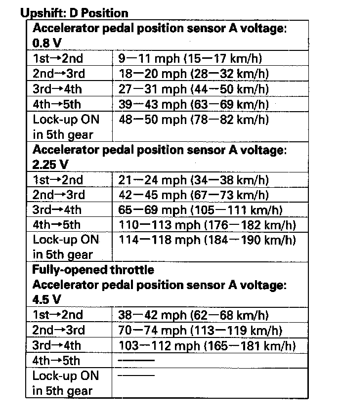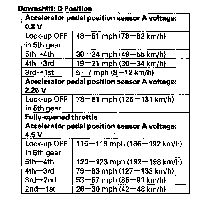 5. Test-drive the vehicle on a flat road in the D position. Check for abnormal noise and clutch slippage. While driving, check that the shift points occur at the proper speeds by monitoring the accelerator pedal position sensor A voltage with the HDS and comparing your shift point speeds and voltage to those in the table. (The accelerator pedal position sensor A voltage represents the throttle opening.)