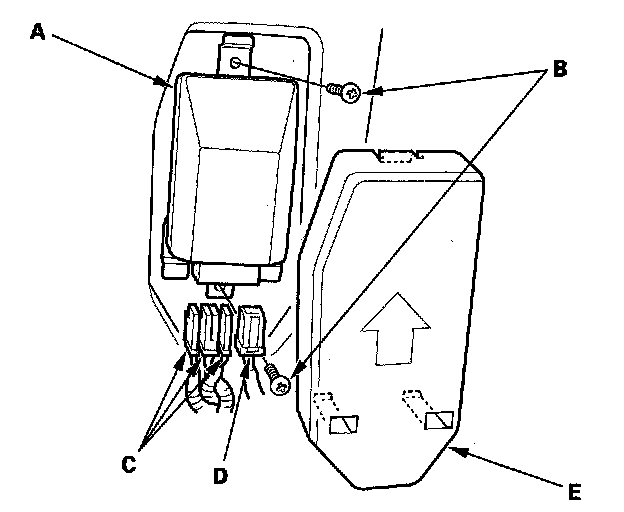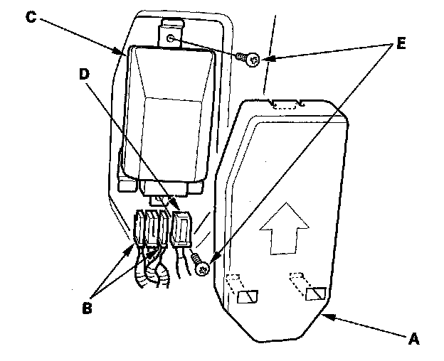 1. Place the new OPDS/ODS unit (A) on the seat-back frame. Tighten the two screws (B), and connect the OPDS unit harness 8P/ODS unit harness 18P connector D and sensor connectors (C) to the OPDS/ODS unit. Reinstall the cover (E).