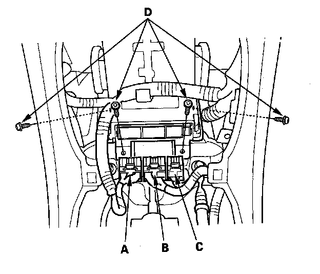 5. Disconnect SRS unit connector A, connector B, connector C, and remove the TORX bolts (D), then pull out the SRS unit.