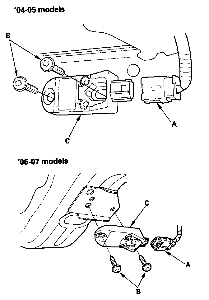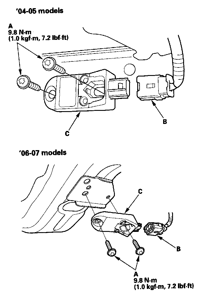 1. Install the new front impact sensor with new TORX bolts (A), then connect the engine compartment wire harness 2P connector (B) to the front impact sensor (C).