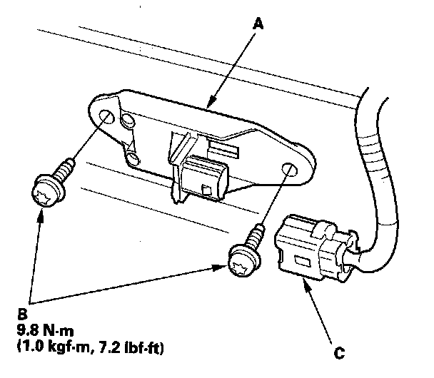 1. Install the new side impact sensor (first) (A) with the TORX bolts (B), then connect the floor wire harness 2P connector (C) to the side impact sensor (first).