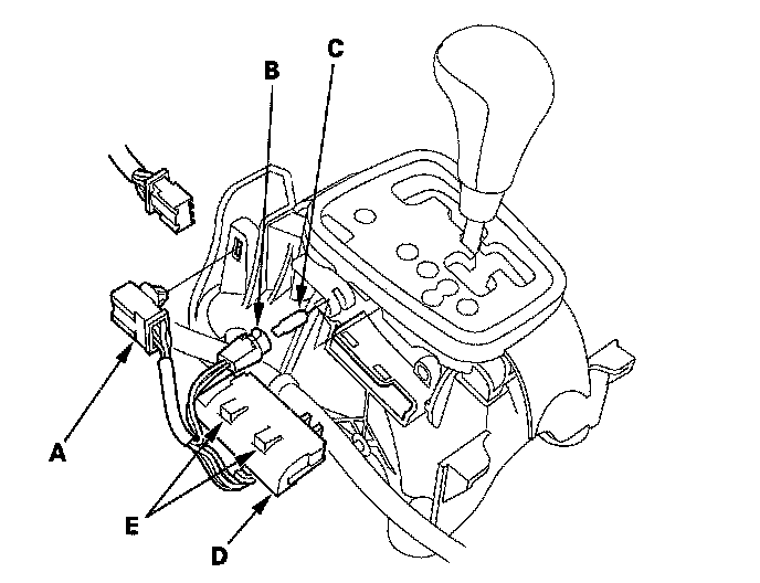 4. Remove the transmission gear selection switch/park pin switch (D) by releasing the lock tabs (E).