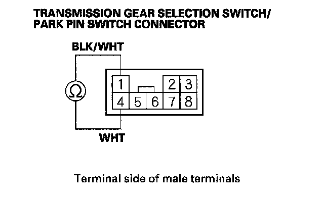9. Check for continuity between transmission gear selection switch/park pin switch connector terminals No. 1 and No. 4 when the shift lever is in the P position, and when the lever shift is out of the P position.
