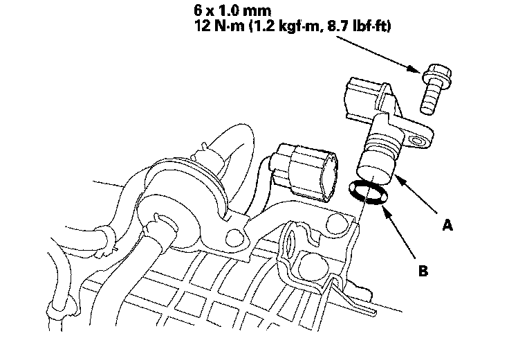 3. Install a new O-ring (B) on the new input shaft (mainshaft) speed sensor, then install the input shaft (mainshaft) speed sensor in the transmission housing.