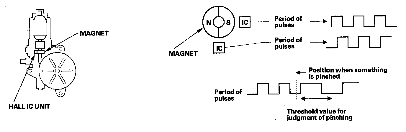 The system is composed of the power window master switch, the power window control unit and the driver's power window motor. The power window motor incorporates a pulser which generates pulses during the motor's operation and sends the pulses to the power window control unit. As soon as the power window control unit detects no pulses from the pulser, the control unit makes the power window motor stop and reverse. This is to prevent pinching your hand or fingers during auto-up operation.