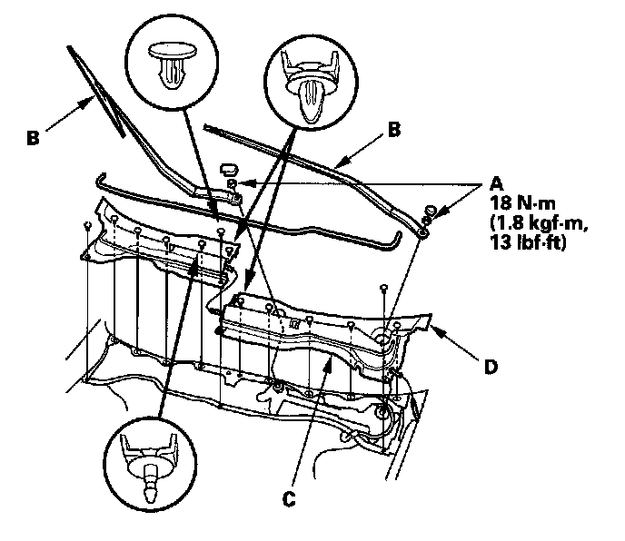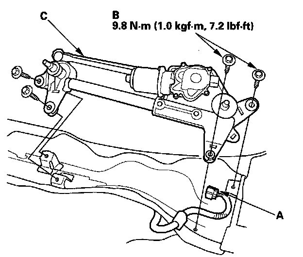 4. Remove the four bolts (B) and wiper linkage assembly (C).