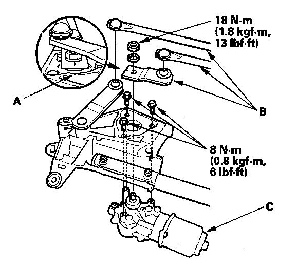 5. Scribe a line (A) across the link and windshield wiper linkage to show the original adjustment. Separate the windshield wiper linkage (B) from the wiper motor (C).