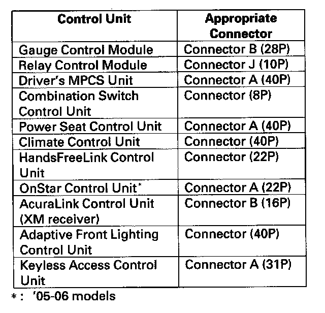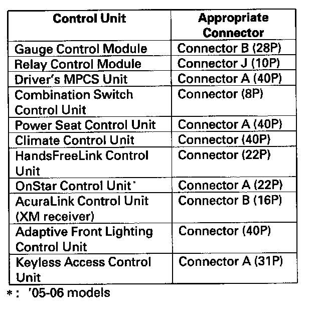 6. Disconnect the appropriate connector at each control unit in the table one at a time. Clear the DTC and wait for 6 seconds, then recheck for DTCs after each unit is disconnected.